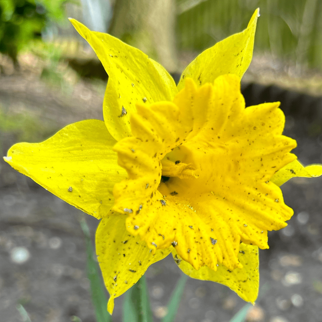 On a walk yesterday I spotted a single solitary daffodil in the distance. It looked stunning with the sun shining on its vibrant yellow petals so I went over to investigate. My dog followed but suddenly, and out of nowhere, decided to take off at a million miles an hour, spraying the poor flower with a dusting of mud and leaves!